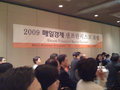 The forum was a panel discussion and there were three panelists, one Korean British and two Americans (one of them Berkeley professor). They all talked about what went wrong and what “definitely” caused today’s economic downturn. Though, it was quite educational, none of the three could predict when and how the economy would get better. They couldn’t even agree on what monetary or federal policies should be implemented to jump start the economy. When economists do not know, then you know we are in deep sh*t. There were a few things they agreed such as stimulus plan, what kind and how. But, I wanted to ask about rising national debt and falling value of dollars in the Q&A time. When it was over, though, I became completely disinterested in what they had to say. Because it doesn’t matter how intelligent they sound if none of their suggestions didn’t get executed and most likely they weren’t.